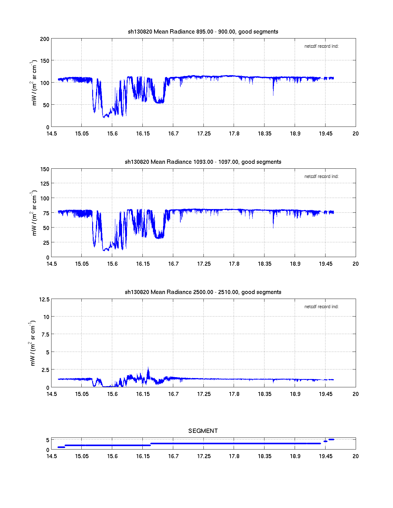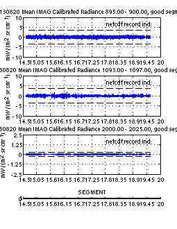 The table below contains 5 plots. The plots are intended to indicate whether questionable calibrated radiances are being included in the distributed science product (netcdf). Questionable radiances are indicated in red and have been identified using the imaginary part of the calibrated radiance. Significant spectral signature in the imaginary part of the calibrated radiance indicates a potential problem with the radiometric calibration of that record.