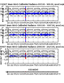 The table below contains 5 plots. The plots are intended to indicate whether questionable calibrated radiances are being included in the distributed science product (netcdf). Questionable radiances are indicated in red and have been identified using the imaginary part of the calibrated radiance. Significant spectral signature in the imaginary part of the calibrated radiance indicates a potential problem with the radiometric calibration of that record.