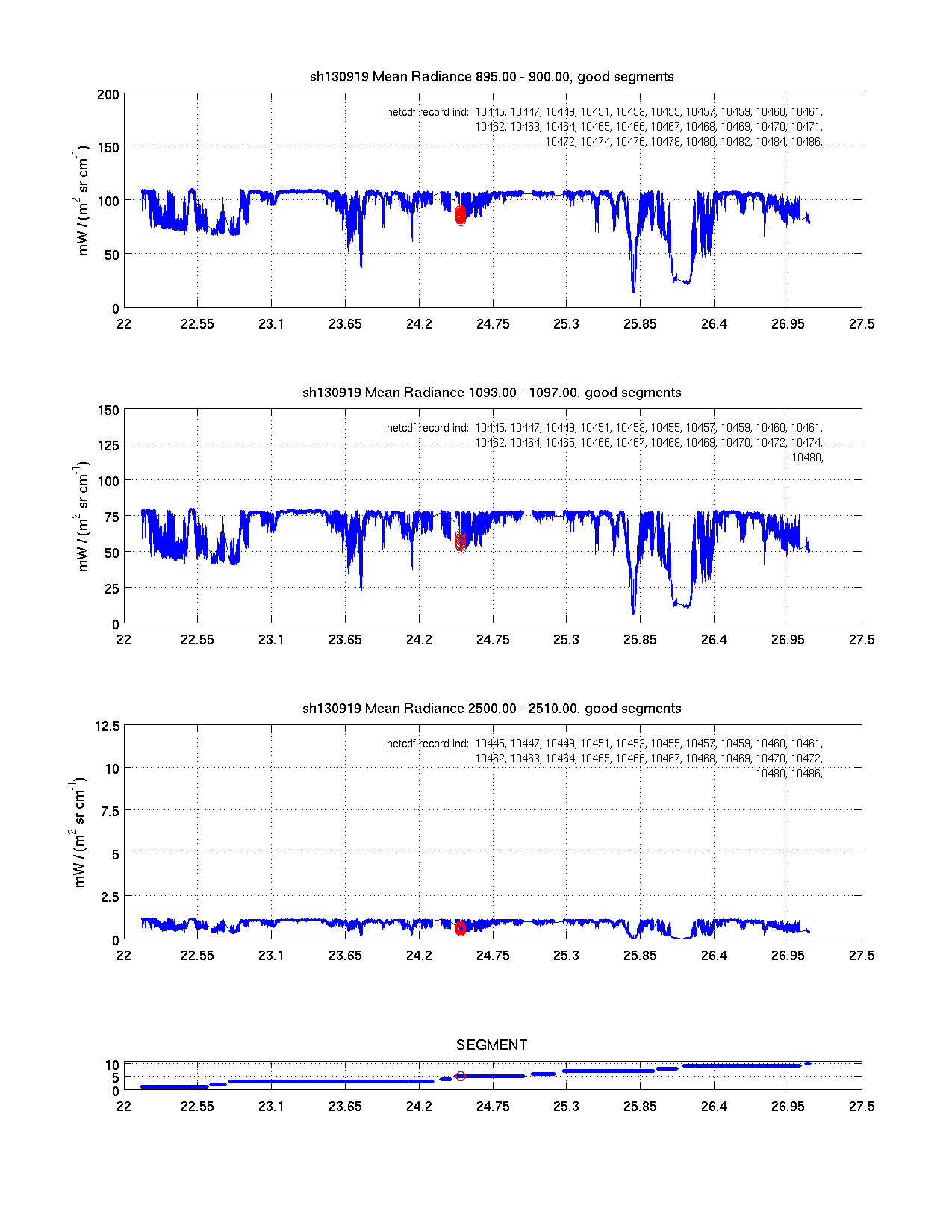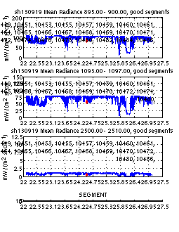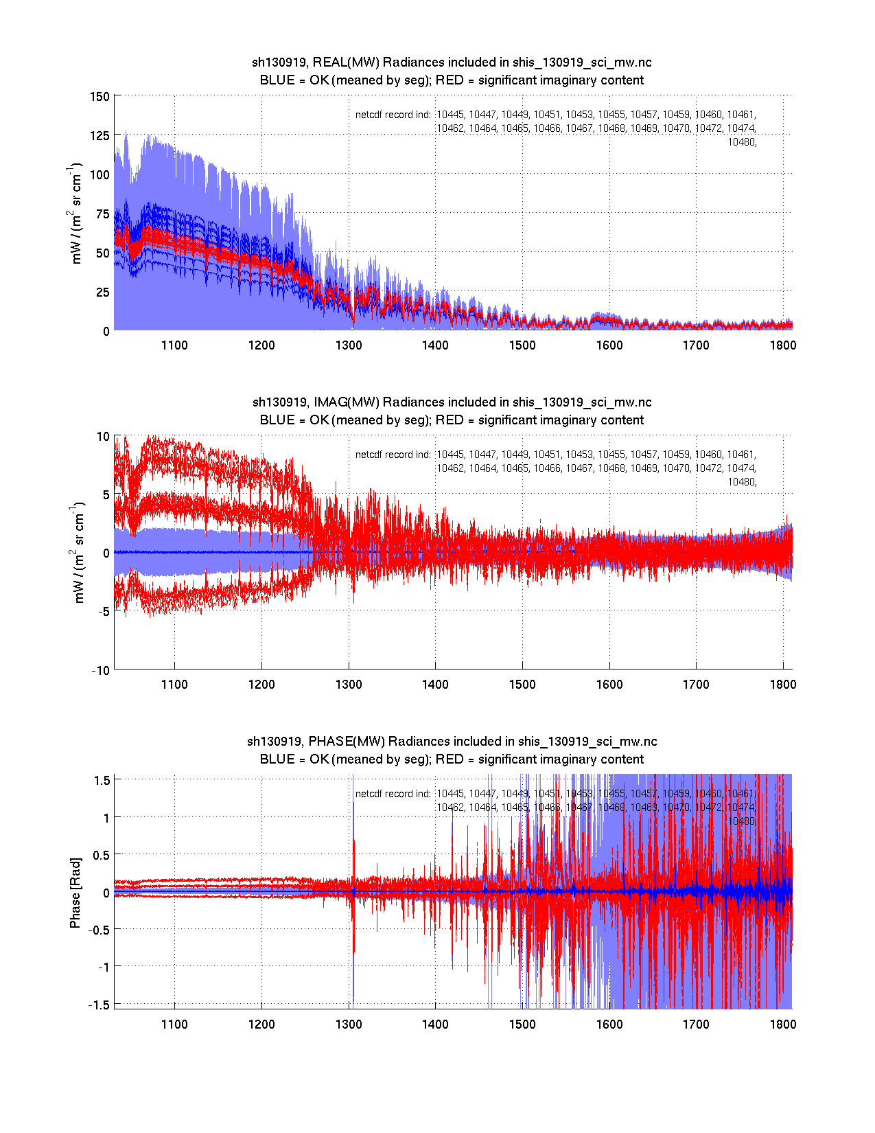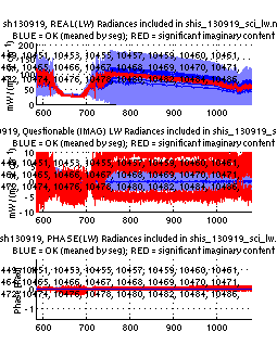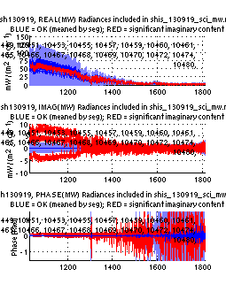 The table below contains 5 plots. The plots are intended to indicate whether questionable calibrated radiances are being included in the distributed science product (netcdf). Questionable radiances are indicated in red and have been identified using the imaginary part of the calibrated radiance. Significant spectral signature in the imaginary part of the calibrated radiance indicates a potential problem with the radiometric calibration of that record.